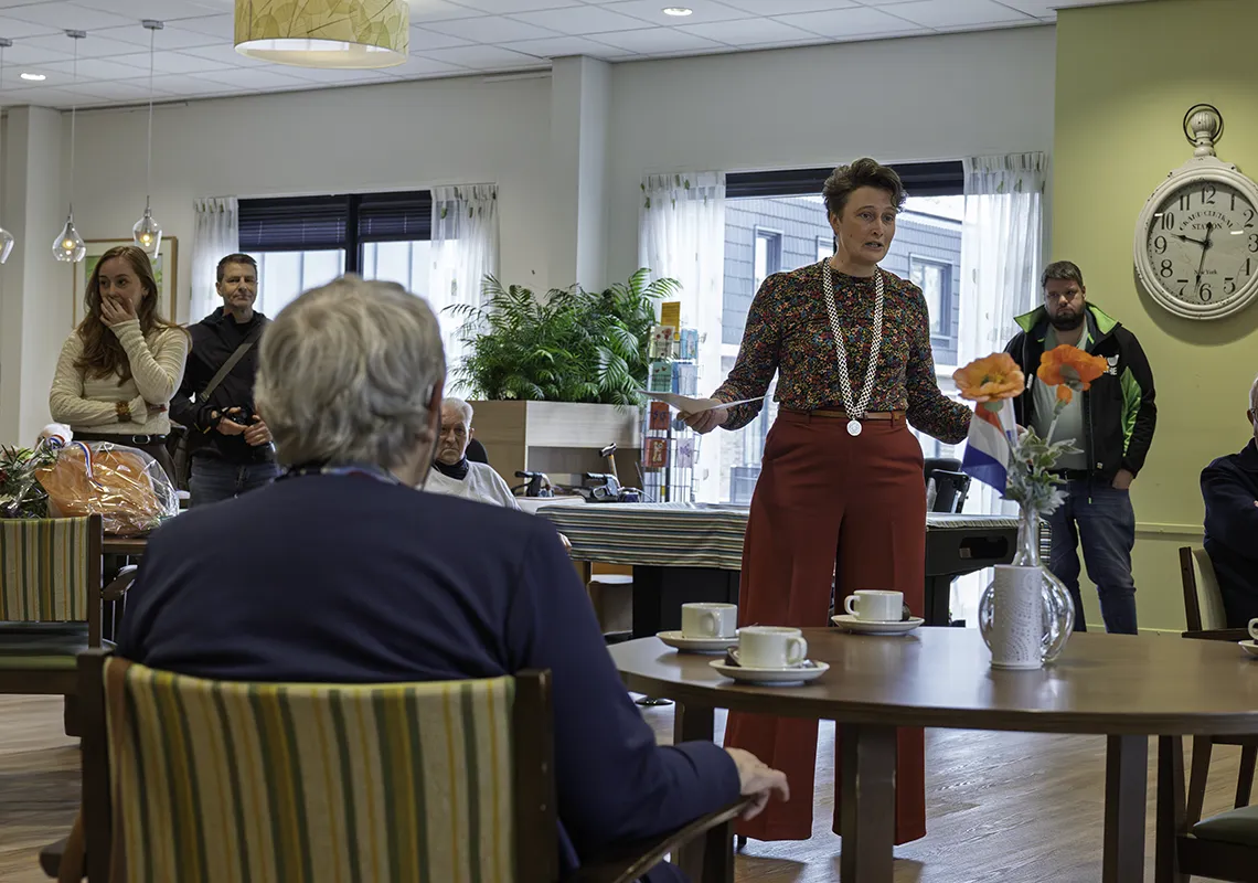 In het restaurant van De Hoprank werd Geesje verrast doordat er allerlei bekenden op haar leken te wachten, zonder dat ze nog besefte wat er stond te gebeuren. Toen om half tien loco-burgemeester Kirsten Ipema de zaal binnenkwam, werd het Geesje wel duidelijk dat zij vandaag in het middelpunt zou staan.