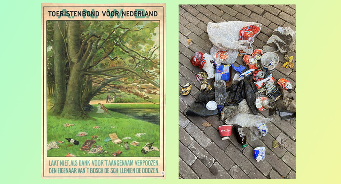 Honderd jaar geleden was het al een probleem waar de maatschappij werd opgeroepen om zelf handelend op te treden. Op de afbeelding van de ANWB uit 1926 wordt al opgeroepen om als dank voor het aangenaam verpozen niet den eigenaar van t bosch met de schillen en de doozen te laten zitten.