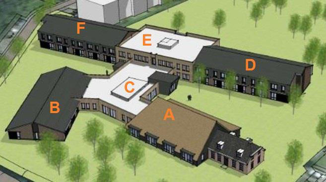 In de nieuwbouw (B, C, A) zijn naast gezamenlijke en personeelsruimtes ook 20 appartementen gerealiseerd. In het voorjaar zullen 20 van de ± 50 huidige bewoners deze appartementen betrekken.