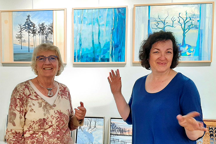 Rianne Kooijman (l), bekend van haar verstilde waddenaquarellen en landschappen, heeft weer veel werk verzet om subsidies, locaties, kunstenaars, musici, dichters en catering te regelen. Glaskunstenares Linda van Huffelen (r), van Glasuniek uit Norg, heeft een prachtig routeboekje gecomponeerd waar alle deelnemers in staan met een kunstwerk en een uitleg over hun denk en werkwijze.